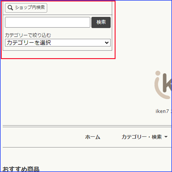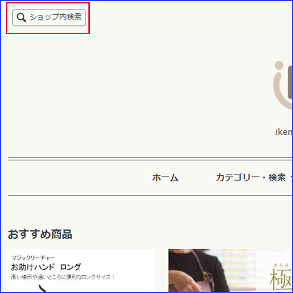 | ①商品一覧ページの左上にあるショップ内検索をクリック | ②お探しの商品のキーワードを入力し、入力欄の右側にある検索をクリック | ③キーワードに関連した商品が表示されます。 |